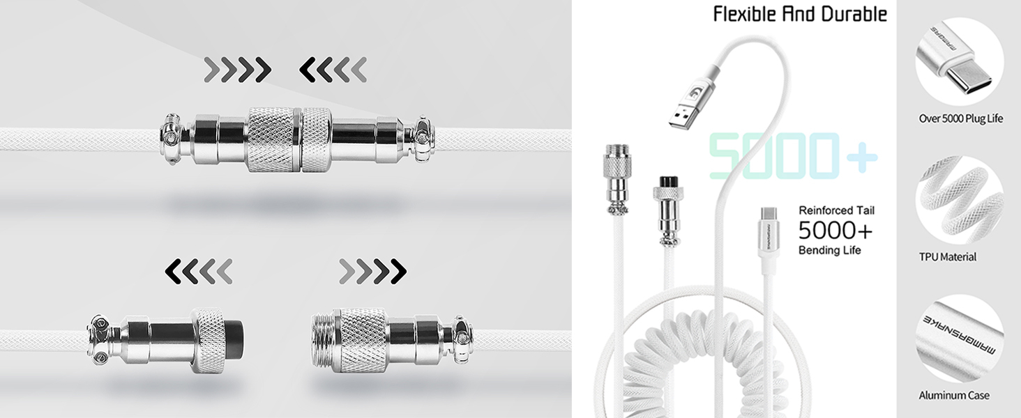 【Metal Aviation Connector & High Speed Charging】With Heavy-Duty Metal 4-Pin Detachable Aviator cable Connector, allows you to quickly attach different cables to your keyboard or other accessories. Supports safe fast charging and data sync. Type-C interface design, perfectly meet all USB-C gaming keyboard powered and connect needs, including the RK61, M75, K55, SKYLOONG SK61 and more.